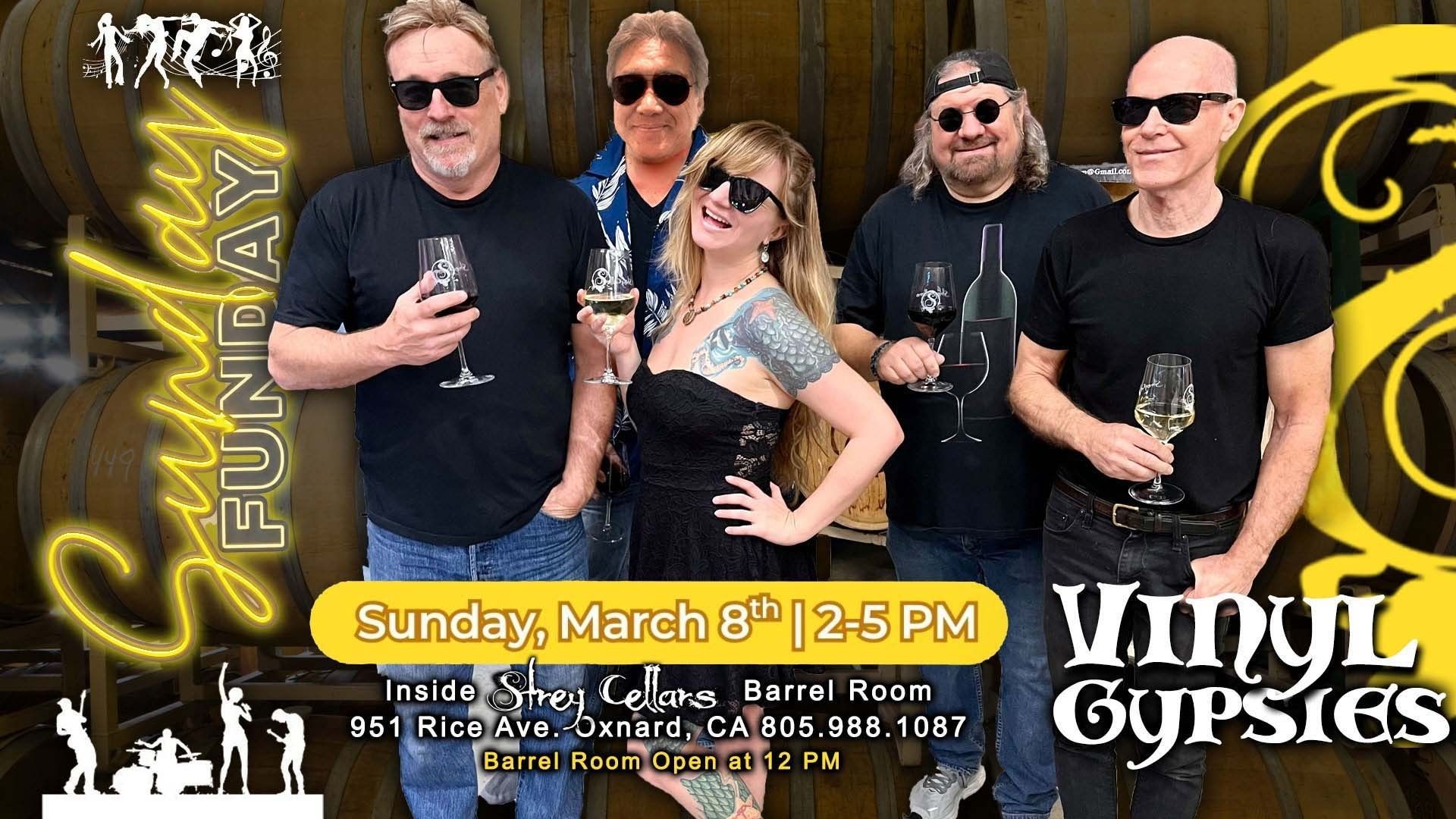 SUNDAY FUNDAYs ROCK at Strey Cellars. We’re featuring the Vinyl Gypsies LIVE in our barrel room March 8th 2-5p. Winery Doors OPEN 12-6p. Guest Kitchen to be announced. Join us for classic