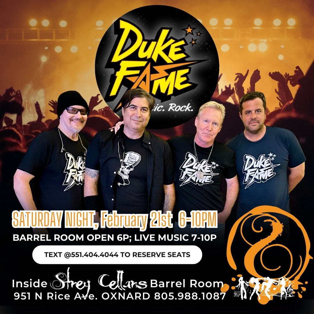 S.A.T.U.R.D.A.Y. NIGHT featuring a brand new band to Strey Cellars, Duke Fame LIVE 7-10p. Barrel Room Doors OPEN at 6p; PACK A PICNIC or GRUBHUB WELCOME. “So-Cal’s
