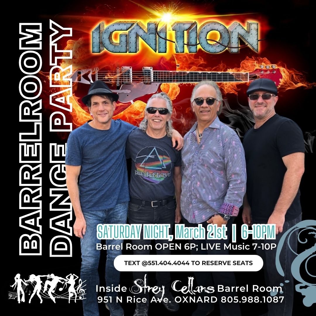 SATURDAY NIGHT with IGNITION LIVE 7-10p. Barrel Room Doors OPEN at 6p. No food truck currently confirmed for this event. Pack a picnic or GrubHub WELCOME. One of Ventura County’s Premier and most