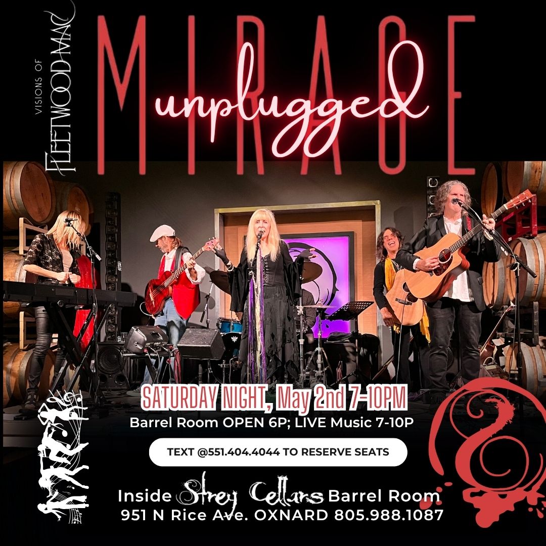 S.A.T.U.R.D.A.Y. NIGHT with Mirage Unplugged LIVE 7-10p. Barrel Room Doors OPEN at 6p; PACK A PICNIC or GRUBHUB WELCOME. Join us for an epic musical tribute to Stevie Nicks by Mirage-Visions