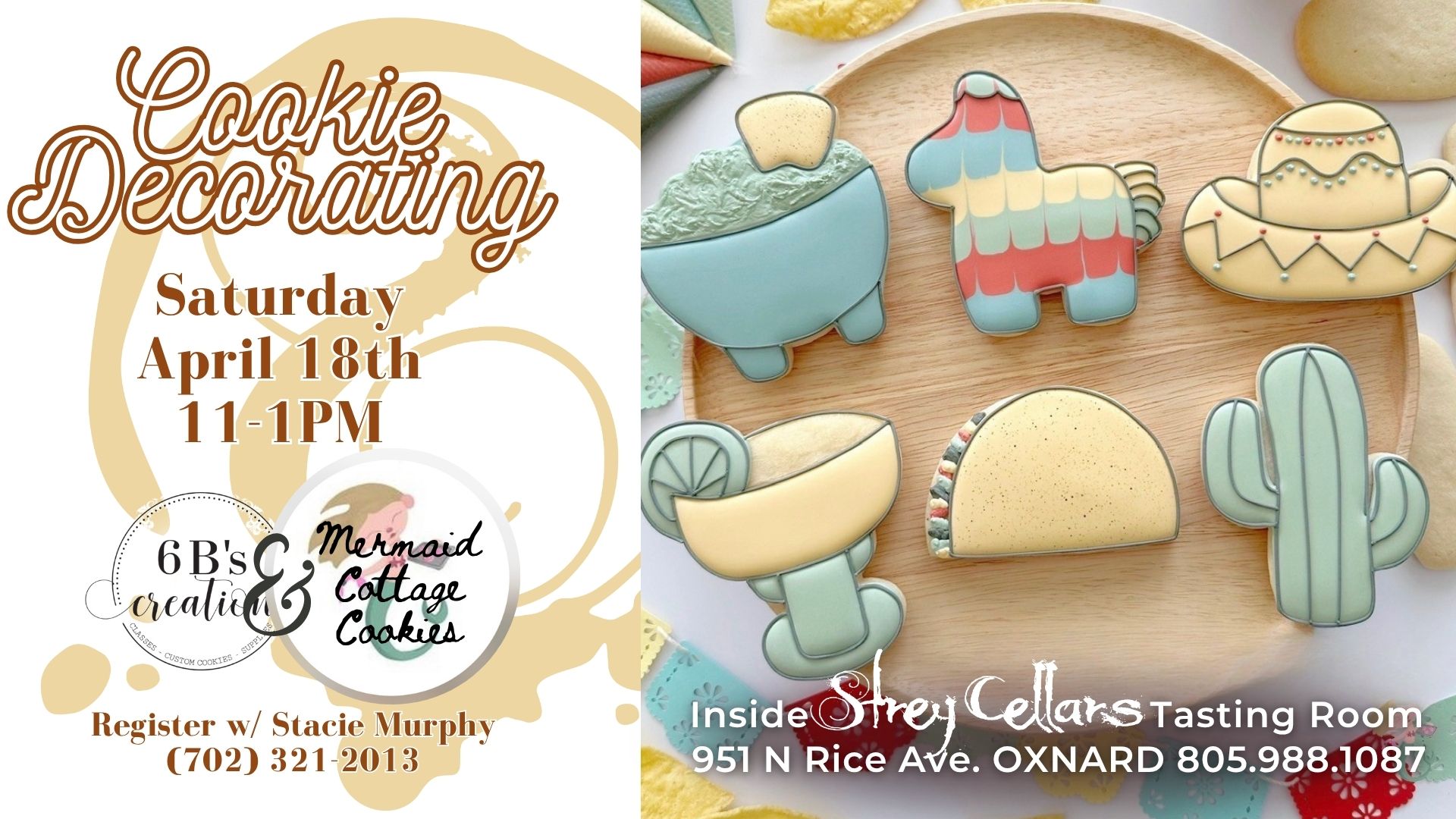 Grab you friends or come make some new ones at this 6B’s Creation (Teaching Partners) Cookie Decorating Class lead by Mermaid Cottage Cookies. $45 includes all supplies and step by step, in person instruction by Stacie Murphy on how to decorate these six depicted “Cinco De Mayo” Themed cookies. This class is open to any and all ages. Beginners welcome. Wine not included in price. Please reach out and register via text Stacie Murphy “Mermaid Cottage Cookies” (702) 321-2013.