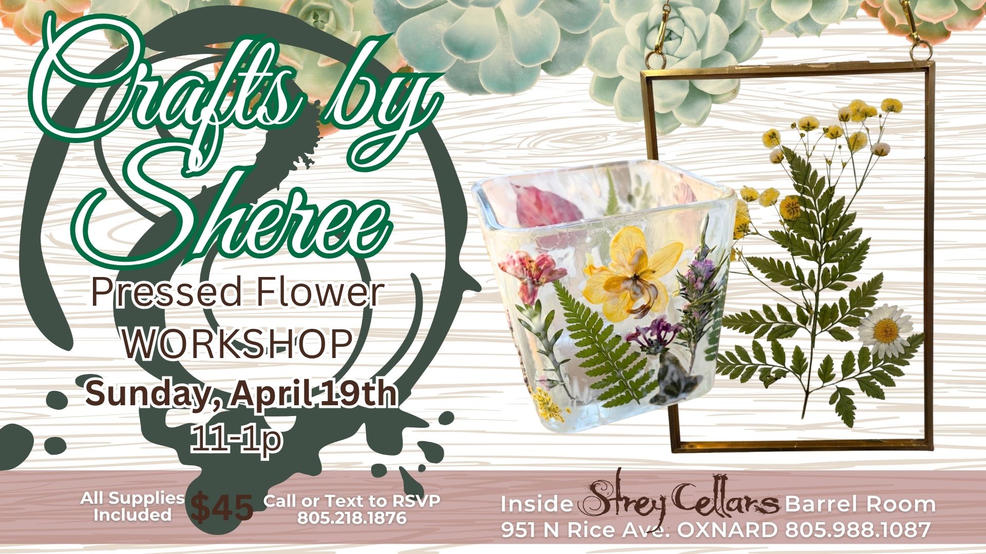 Join us for a special “Crafts by Sheree” Workshop!! Grab your friends or come make some new ones. We are delighted to feature Sheree Millhollin in our barrel room. $45 per participant includes all supplies and step-by-step instruction during this 2hour workshop to create your very own Pressed Flower Vase AND Framed Decor. Take some time for yourself, craft with us and relax with a glass of wine or two!