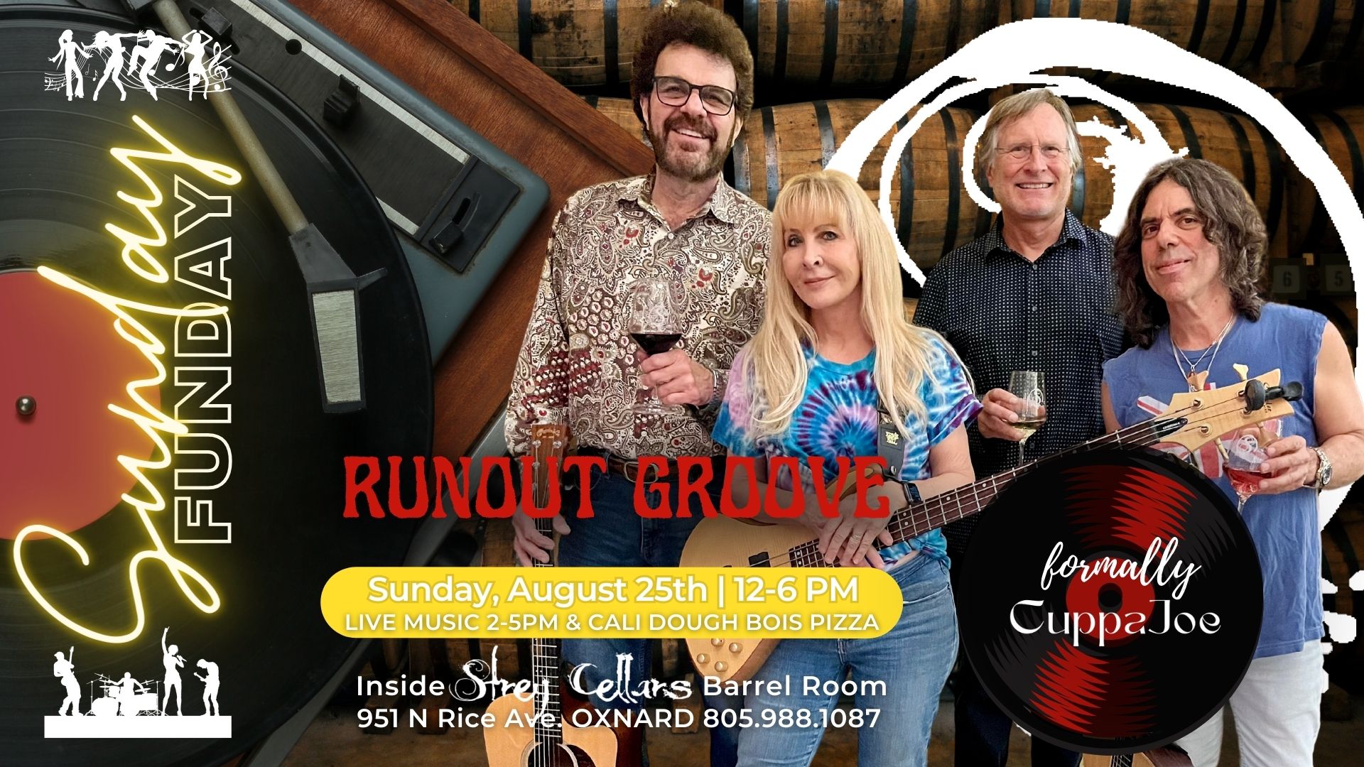 SUNDAY FUNDAYs ROCK at Strey Cellars. We’re featuring Runout Groove (formally Cuppa Joe) LIVE in our barrel room August 25th 2-5p. Winery Doors & Cali Dough Bois Pizza Guest Kitchen OPEN 12-6p.